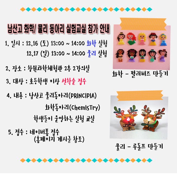 12/16(토) - 화학동아리 실험교실 접수하기→ http://naver.me/5oVWEbZL 12/17(일) - 물리동아리 실험교실 접수하기 → http://naver.me/5N0m19ac 문의 : 055)267-2676
