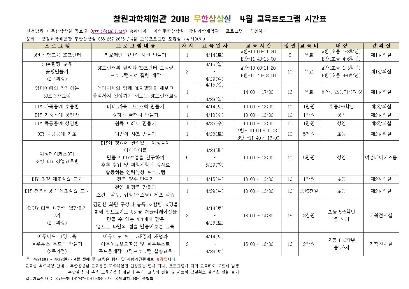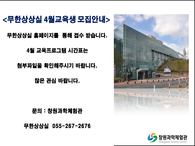 창원과학체험관 무한상상실 홈페이지 바로가기 → http://www.ideaall.net/center/index.php (선착순접수) 프로그램검색 > 정기프로그램 > 신청하기