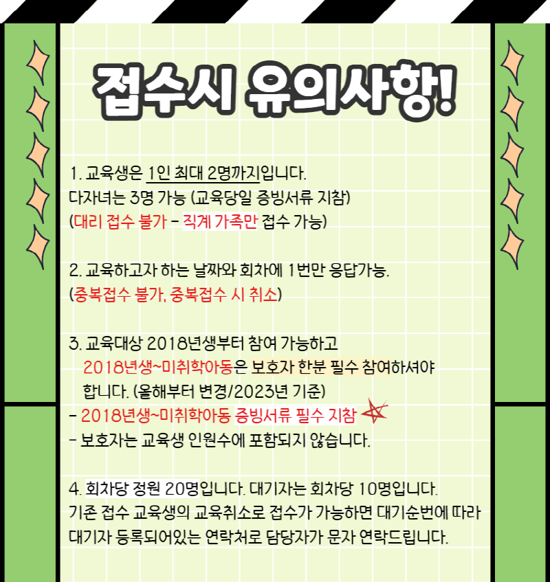 * 2018년생부터 접수 가능하고, 2018년생~미취학 아동은 부모님 1명 교육참여 필수입니다.