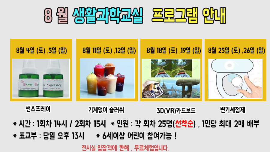 8월 생활과학교실은 확대편성하여 2회 운영합니다. 많은 관심 바랍니다.