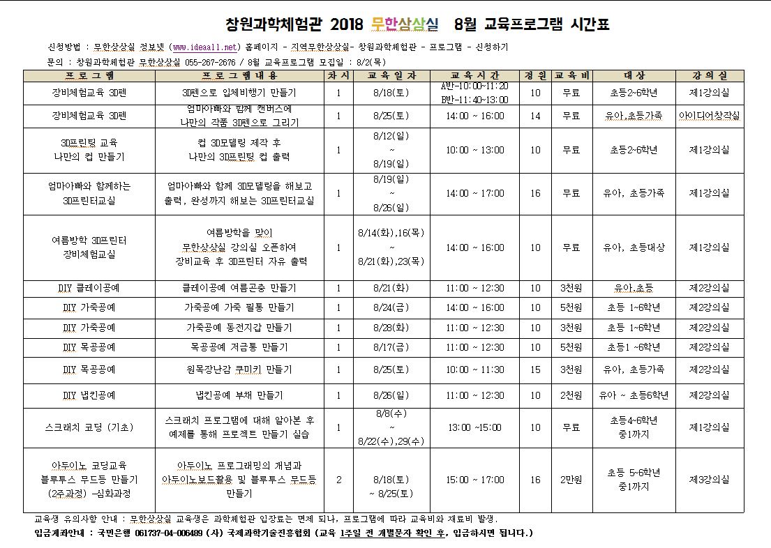 8월 무한상상실 프로그램 공지일 변경 되어 미리 안내 드리오니, 접수일 확인하시고 교육접수 시 , 착오없으시길 바랍니다. 8월만 첫째주에 공지합니다. 기존 - 매달 둘째주 화요일 공지. 8월 무한상상실 프로그램 공지 : 8월 2일 (목) 11시 공지 * 접수신청서는 8월 2일 목요일 11시에 무한상상실 홈페이지에 올라갑니다. 문의 : 창원과학체험관 무한상상실 (055-267-2676)