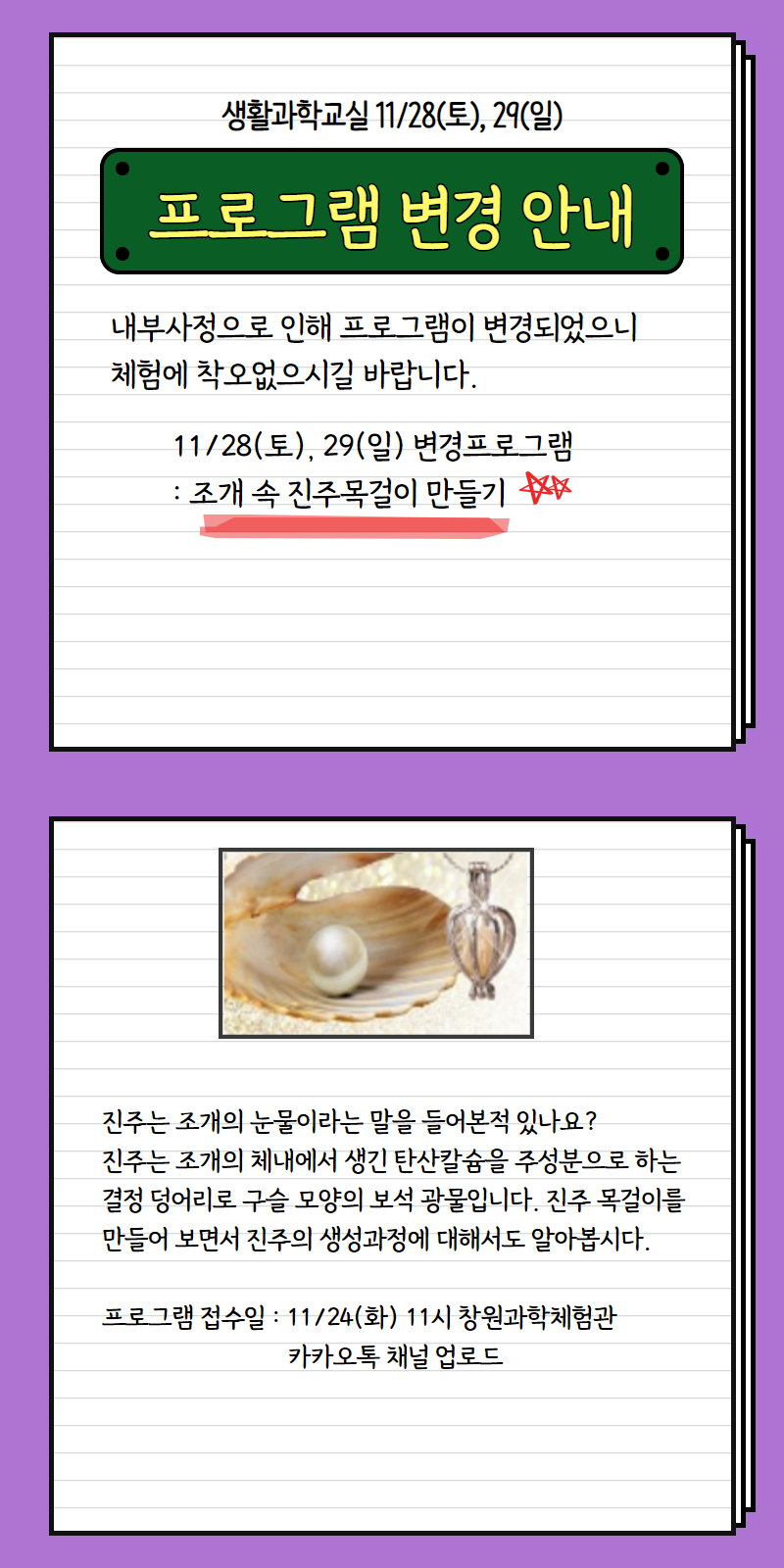 [공지] 11/28(토),29(일) 생활과학교실 프로그램 변경안내